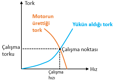 Motor daha çok tork ürettiği için hız düşer diye saçma bir yoruma varılmamalıdır. Yükün aldığı torkun hıza göre eğrisi ise pozitif eğimli olup "alınan tork arttığı için hız artar" diye yorumlanır.